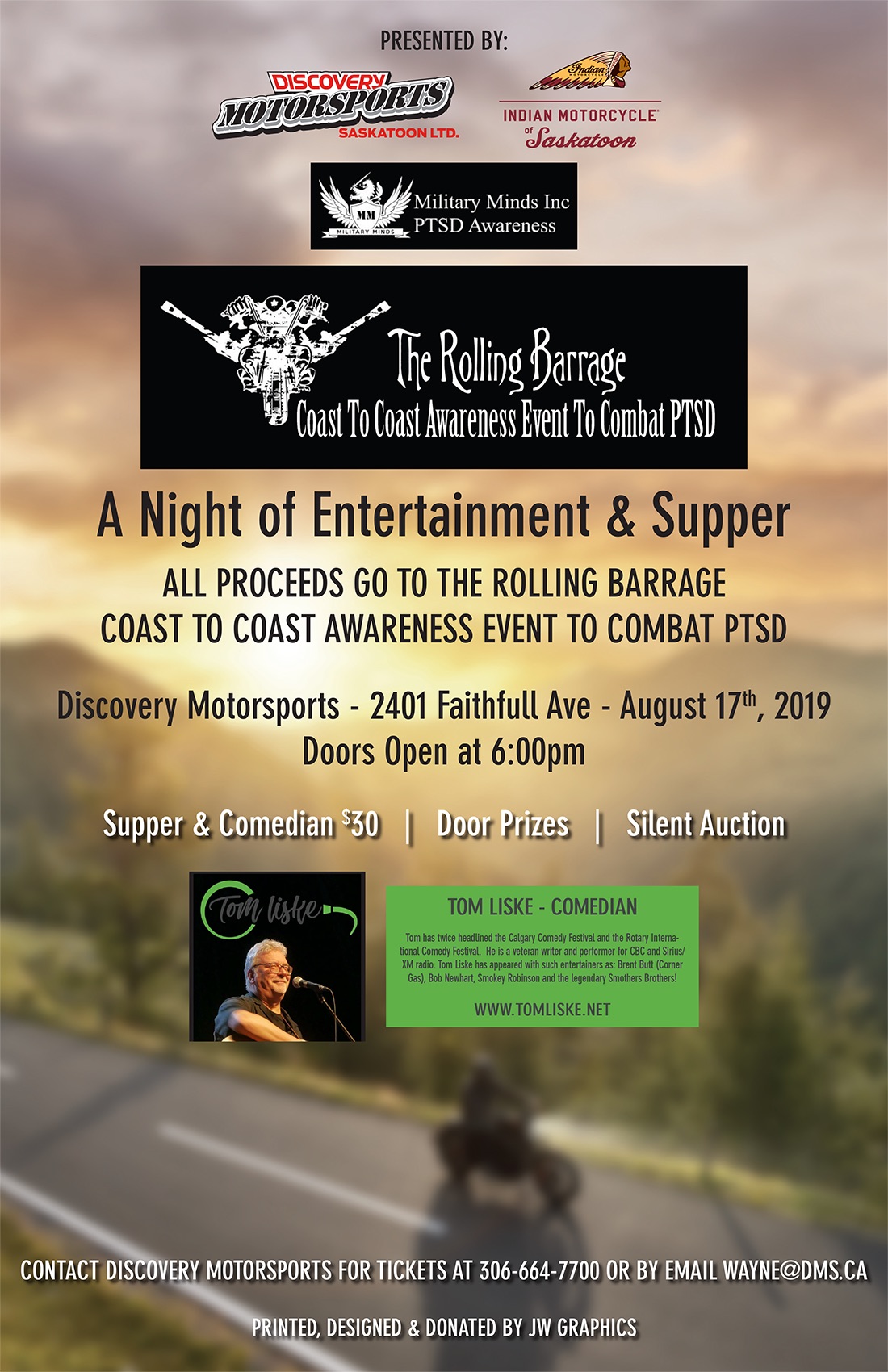 The Rolling Barrage is a rolling fundraiser presented by Military Minds Inc, in support of veterans, serving members and first responders, as a show of strength, and unity to conquer the stigma of PTSD. JW's father manages Discovery Motorsports, representing Indian Motorcycle in Saskatoon. Both of which companies hold the "rolling fundraiser" when they stop here in Saskatoon.